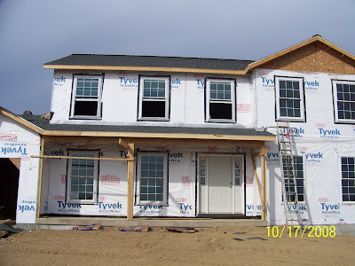 I worked on staining again today. I finally got all the trim done, and I started in on the baseboard. Got to one bundle and it wasn't the right stuff, so I called Ray and he has to send it back. I still have to get the rest of the window jams to stain yet, they are coming soon. It was SO COLD today! I had on a sweatshirt, with the hood up and tied tight!! It was in the 40's and about 10-15 mile per hour wind! Needless to say, it was FREEZING!! So I didn't work to fast! :( We ordered pizza for lunch, and we called it quits around 3. We came home and I finally broke down and turned the heat on. I hated to do it, but we're freezing!!